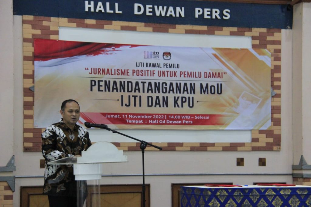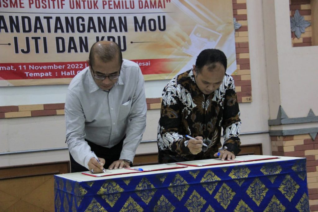 JAKARTA – Ikatan Jurnalis Televisi Indonesia (IJTI) resmi menandatangani nota kesepahaman atau Memorandum of Understanding (MoU) dengan Komisi Pemilihan Umum Republik Indonesia (KPU RI) di Hall Gedung Dewan Pers, Jalan Kebon Sirih, Jakarta Pusat, Pada Jumat 11 November 2022. MoU ditandatangani langsung Ketua Umum IJTI Herik Kurniawan dan ketua KPU Hasyim Asy’ari. Hadir juga Wakil Ketua Dewan Pers Agung Dharmajaya, Pengurus IJTI serta Konstituen Dewan Pers.